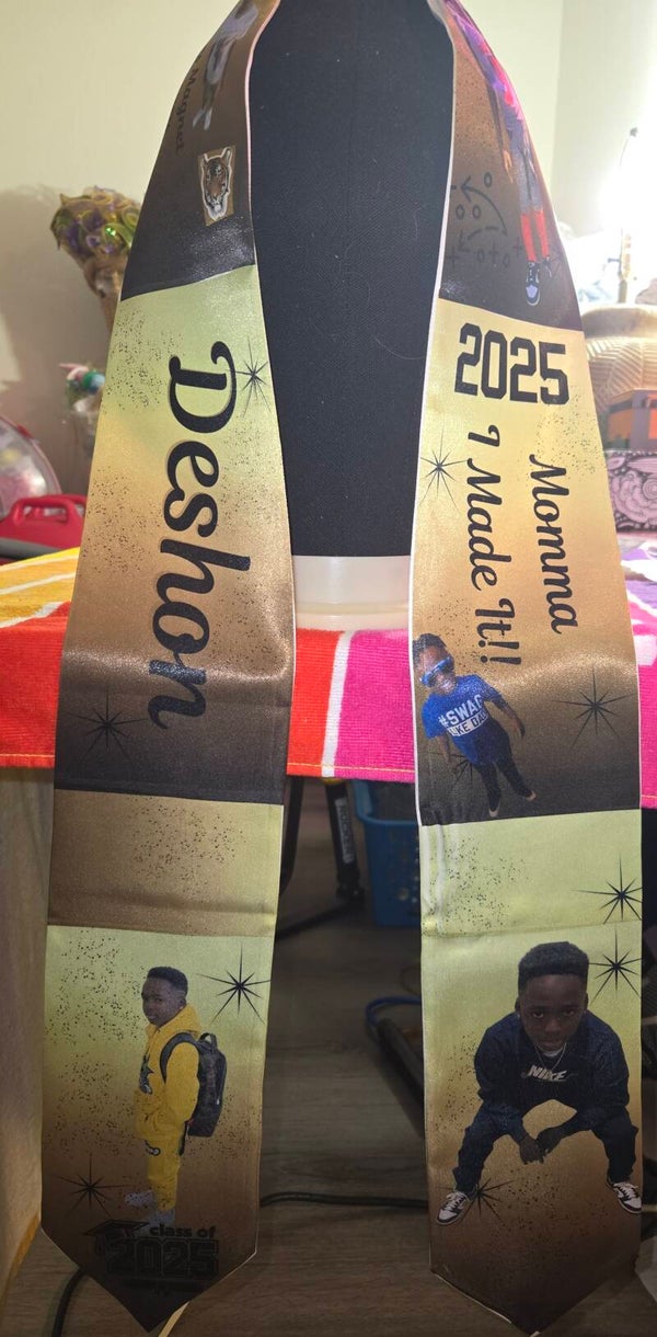 Celebrate your graduate's achievements with a Custom Graduation Stole from Designs By Beloved. Our Home crafting Designs also offer Hat Toppers, fans, and buttons to ensure all your graduate needs are met, whether they're completing kindergarten, middle school, high school, or college. Each product is thoughtfully crafted to support and honor your graduate's accomplishments with style and pride. Trust Designs By Beloved for high-quality, personalized keepsakes that make their special day even more memorable.
